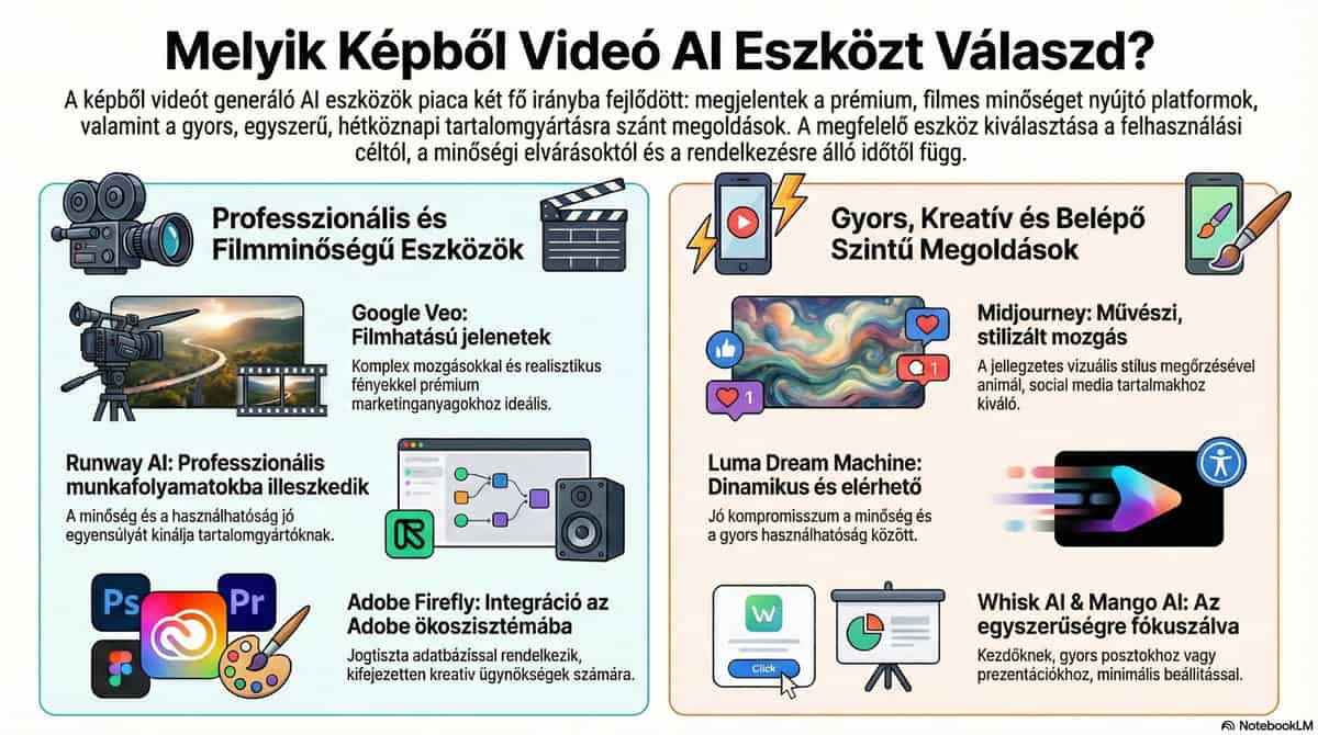 A kép → videó AI eszközök piacán egyértelműen látszik a specializáció. A Google Veo és Flow a filmes minőséget célozza, a Runway és a Luma a professzionális, de rugalmas felhasználást, míg a Midjourney, Whisk és Mango inkább kreatív vagy gyors tartalomgyártási irányba mozdul el. A választás kulcsa nem az, hogy „melyik a legjobb”, hanem az, hogy milyen célra, milyen tempóban és milyen minőségi elvárásokkal szeretnéd használni ezeket az eszközöket.