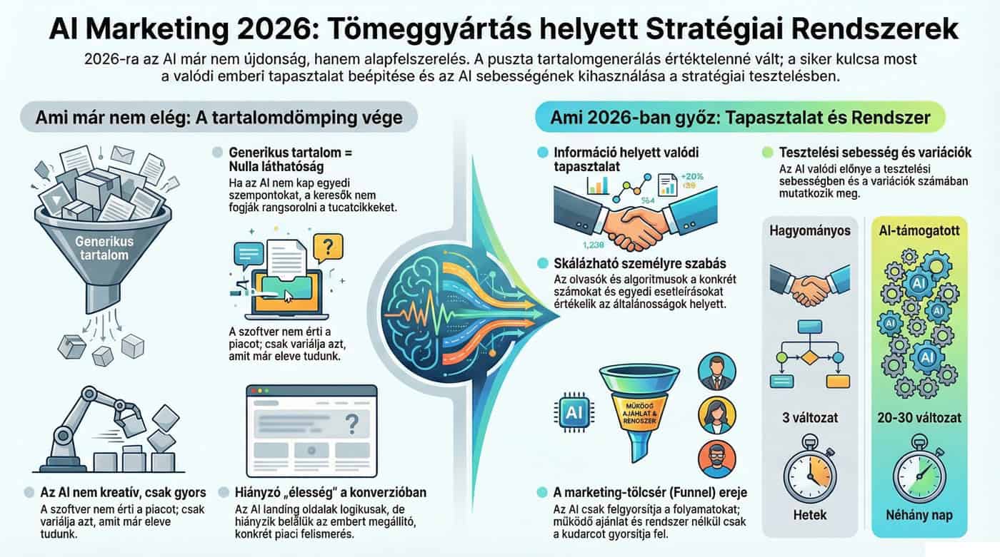Volt egy időszak, amikor az AI marketing egyenlő volt azzal, hogy „gyártsunk minél több tartalmat”. Blogcikkek, Facebook posztok, termékleírások – ment minden automatizálva. Gyors volt, olcsó volt, és egy ideig még működött is.